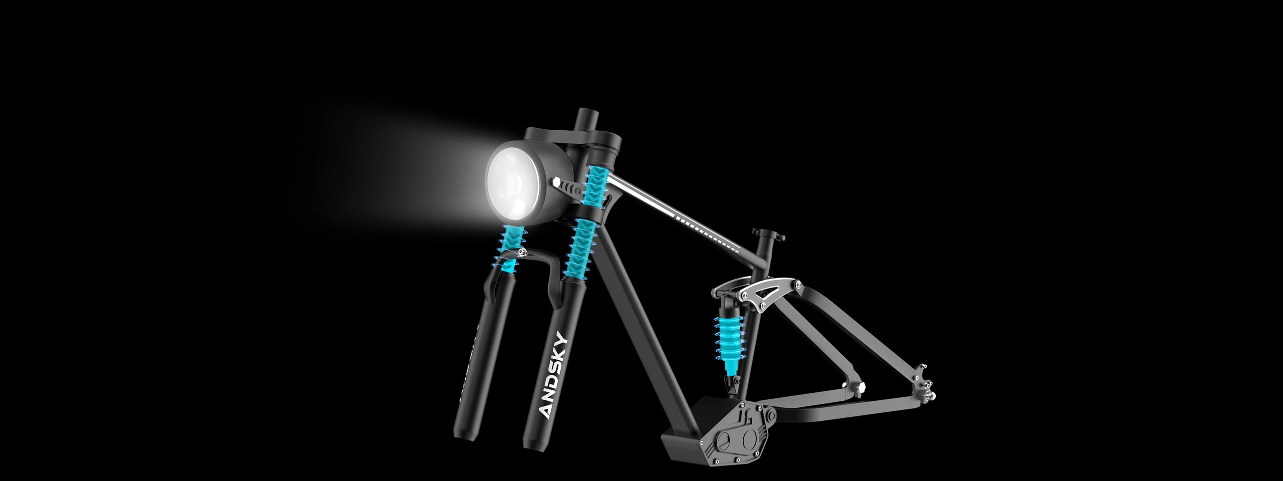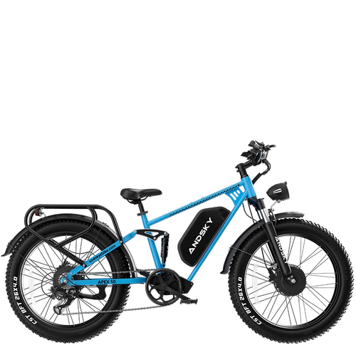 The 48V Apex 50 features a single-shoulder suspension fork, dual motors with a peak power of 3000W, and an advanced AWD system that lets you easily switch between rear-wheel, front-wheel, or dual-wheel drive. Now upgraded to reach a top speed of 56 km/h, it's perfect for longer rides and daily commuting. Equipped with a compact headlight, the Apex 50 offers smooth, efficient performance for city streets and well-paved roads.